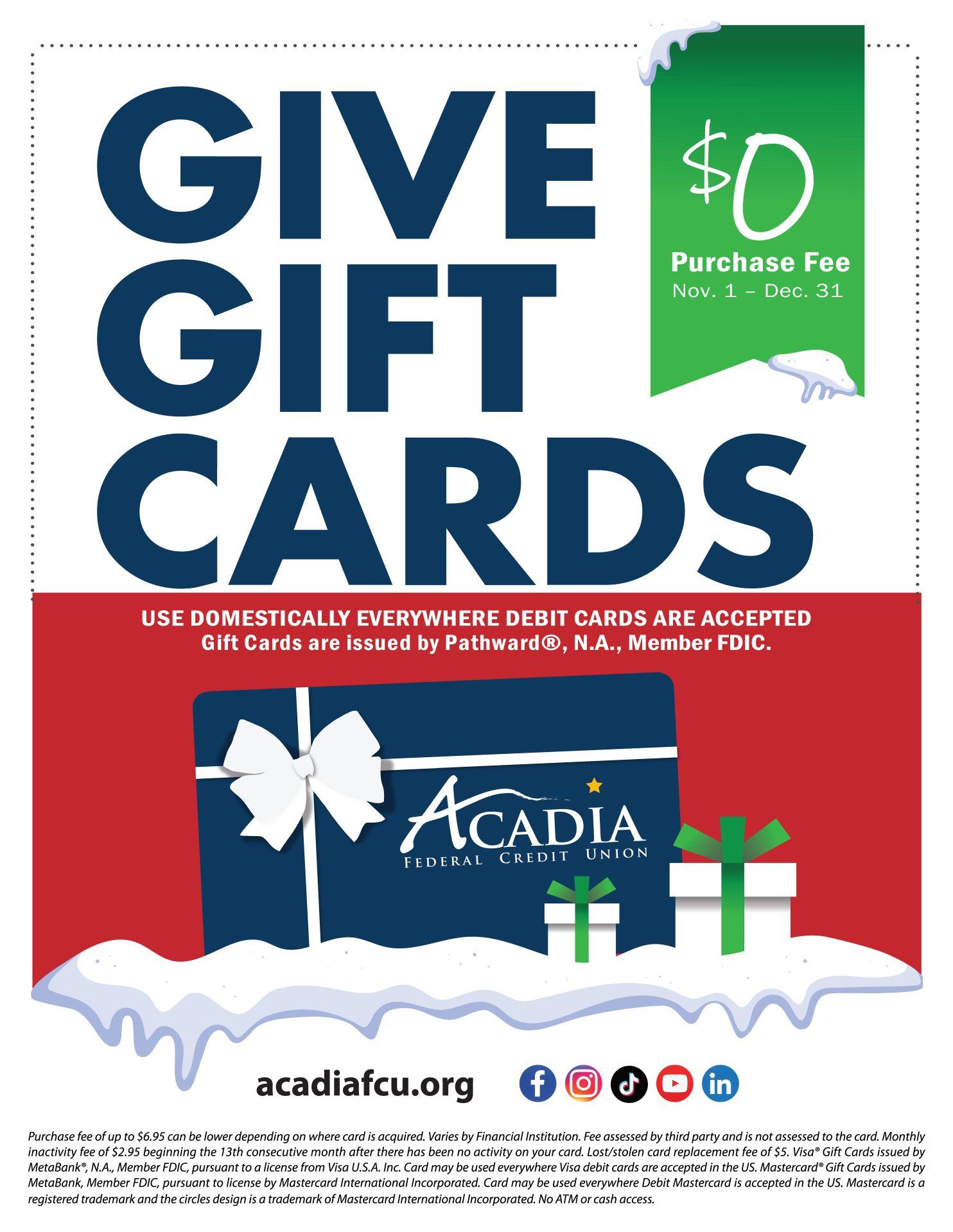 Pick up your Acadia FCU No Fee Gift Cards today at any of our branch locations and make your holiday giving merry and bright.