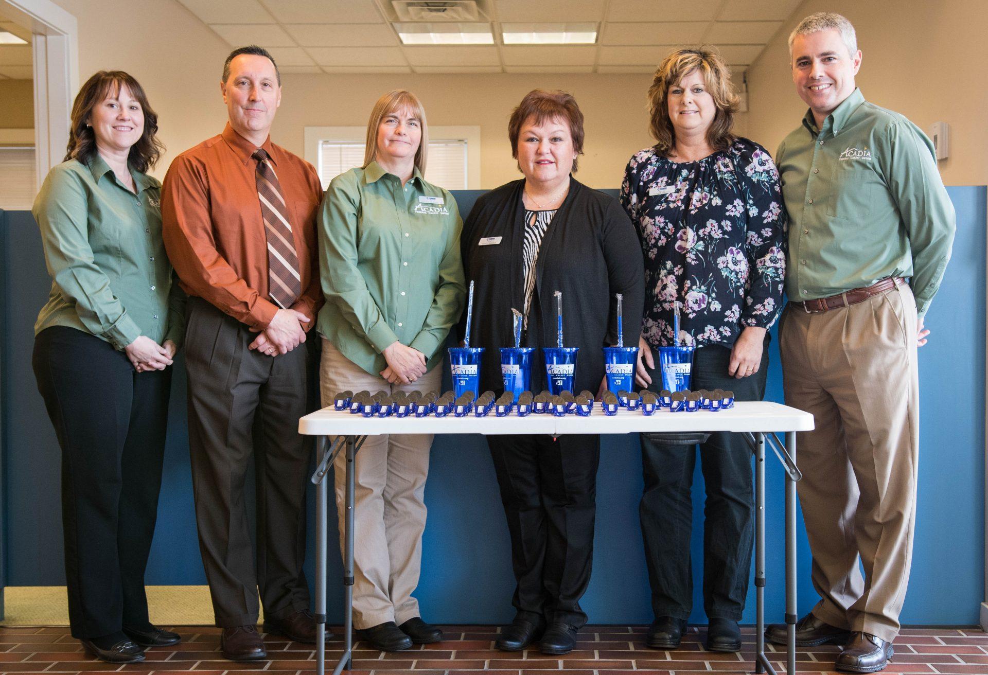 Pictured are Acadia FCU staff members Erica Albert – Accounting Manager, Jim Pelletier – Director of Business Development (former CEO of EMMC FCU), Kim Baker – Accounting Assistant (former EMMC FCU), Sue York – Branch Manager (former EMMC FCU), Kelly Babcock – Member Service Rep. (former EMMC FCU), Luis Sanclemente – Vice President, at the 849 Stillwater Ave. branch in Bangor.