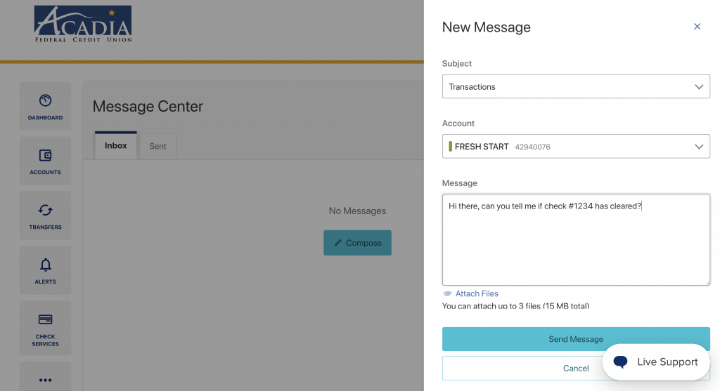 Acadia FCU’s Digital Banking Message Center is a secure way to send a message directly to us, even when it involves sensitive information. Your social security number, account numbers, and other similar personal information will be kept safe and will only be viewed by Acadia FCU staff assigned to the Message Center.