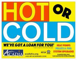 Keep warm or stay cool with a loan from Acadia FCU! Whether you’re looking to install a new heat pump, upgrade your current heating system, or make your home more energy efficient, we’ve got you covered. Take advantage of flexible financing options ranging from 12 to 60 months, all at a competitive APR*! If you’re just getting ready to fuel those cold winter months, you can borrow for up to 12 months at the same great rate to purchase pellets, coal, or heating oil.