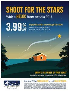 The sky’s not the limit, it’s just the beginning! Whether you’re imagining a brand-new kitchen, planning a well-deserved vacation, consolidating debt, or embarking on a one-of-a-kind personal project, your home’s equity can be the key to making it happen. We want you to enjoy a stellar 3.99% APR* on Home Equity Line of Credit (HELOC) advances from Acadia Federal Credit Union!