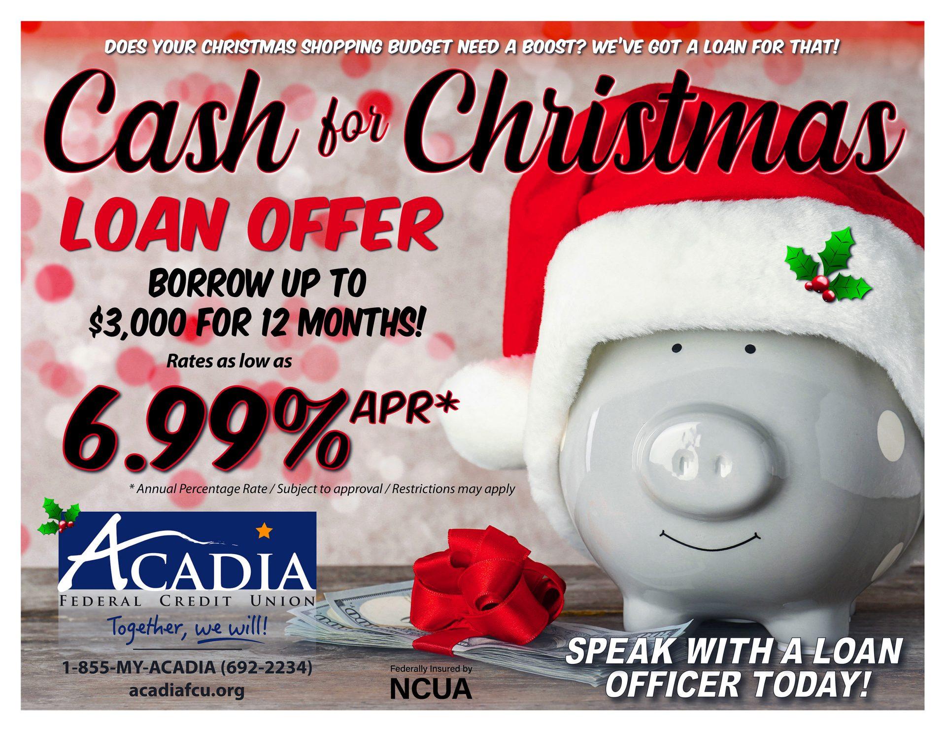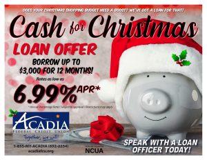 Does your Christmas shopping budget need a little boost? Acadia Federal Credit Union’s got a loan for that! Get Cash for Christmas and borrow up to $3,000 for 12 months with rates as low as 6.99% APR. Acadia’s Cash for Christmas will help make YOUR holidays merry and bright! Believe us when we tell you Santa will appreciate the extra help…